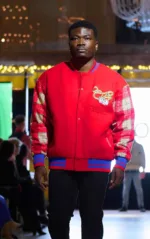 Această jachetă varsity BoohooMAN se remarcă prin combinația de roșu intens cu detalii în carouri pe mâneci, un contrast perfect între stilul clasic și modern. Elementele brodate de pe piept adaugă un aer exclusivist, iar finisajele în albastru și roșu de pe manșete și tiv accentuează estetica sport-lux.